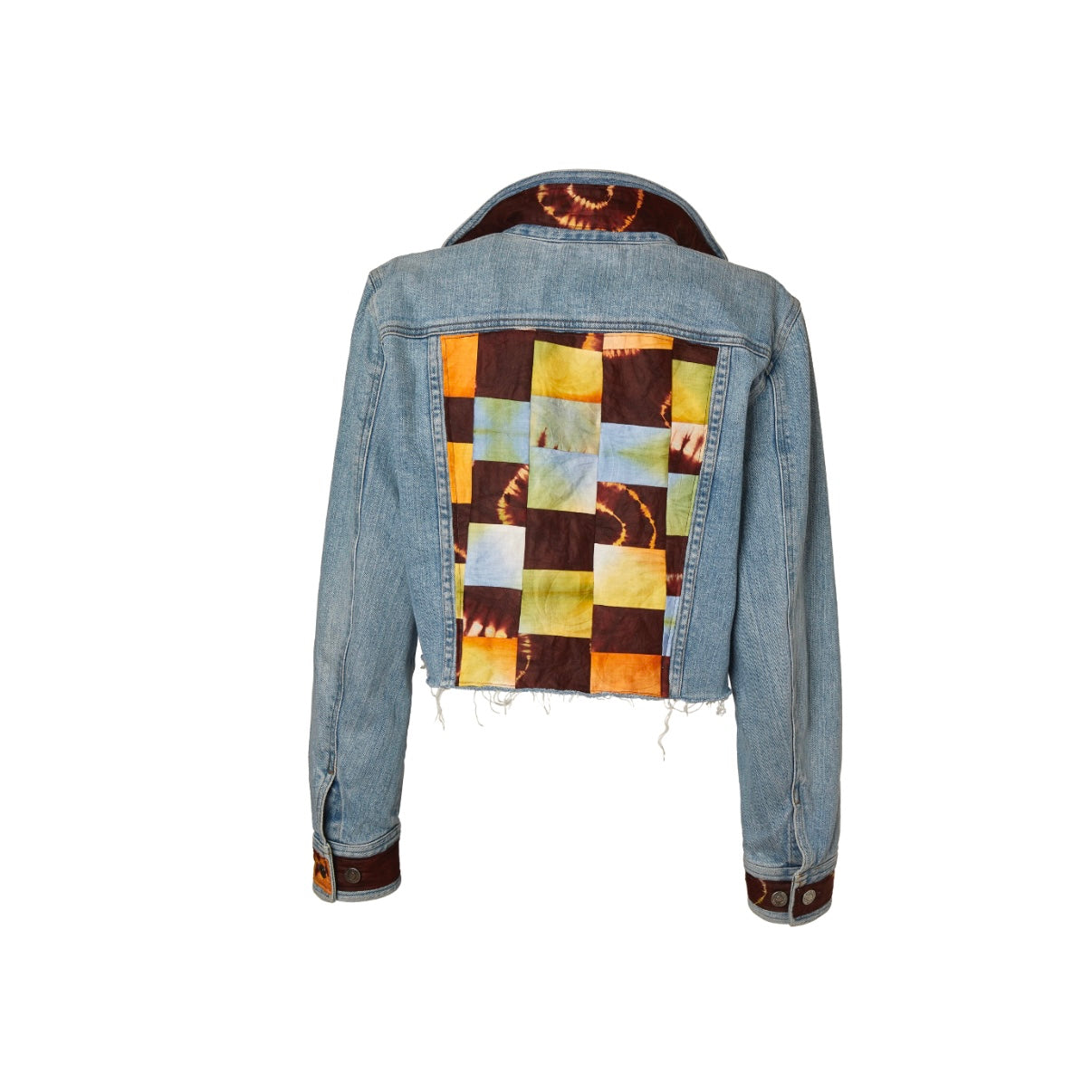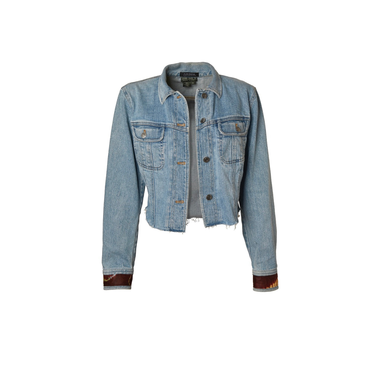 Ralph Lauren, Lauren Jeans Co. jacket. Faded and cropped with frayed edges. Hand-dyed & batiked cotton fabric patchwork enhancements on back, collar, and sleeve. Excellent used condition.